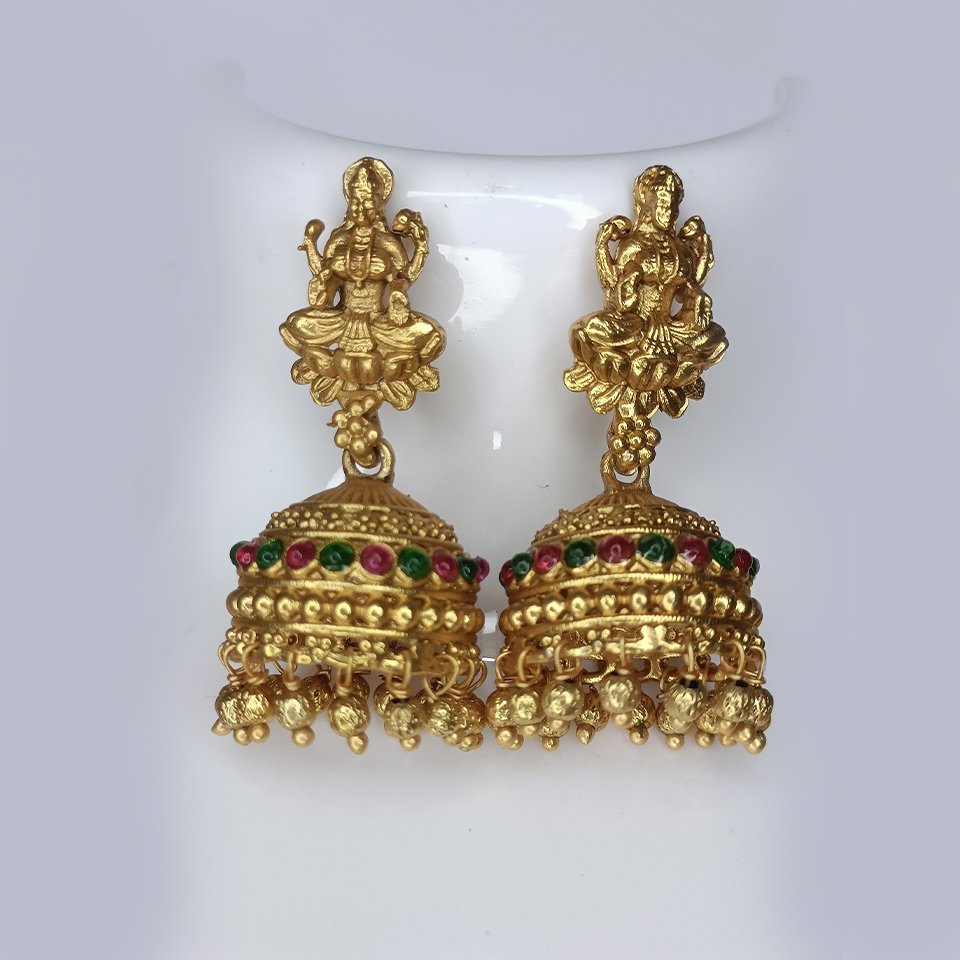 The Ananthika Haaram is a stunning masterpiece inspired by authentic temple jewellery craftsmanship. The long chain is adorned with beautifully sculpted traditional motifs, leading to an exquisite Lakshmi pendant symbolising prosperity and grace. The antique gold finish, detailed carvings, and delicate bead hangings create a majestic look, ideal for bridal wear and festive celebrations. Paired with matching jhumkas, this haaram elevates any traditional outfit with divine magnificence.