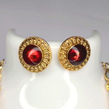 The Anarkali Ruby Necklace is a beautifully crafted traditional jewellery set designed to bring timeless elegance to your festive and ethnic looks. The necklace features a charming sequence of teardrop-shaped ruby-toned stones, each bordered with intricate gold detailing. The symmetrical pattern creates a graceful flow, making the piece eye-catching yet refined.