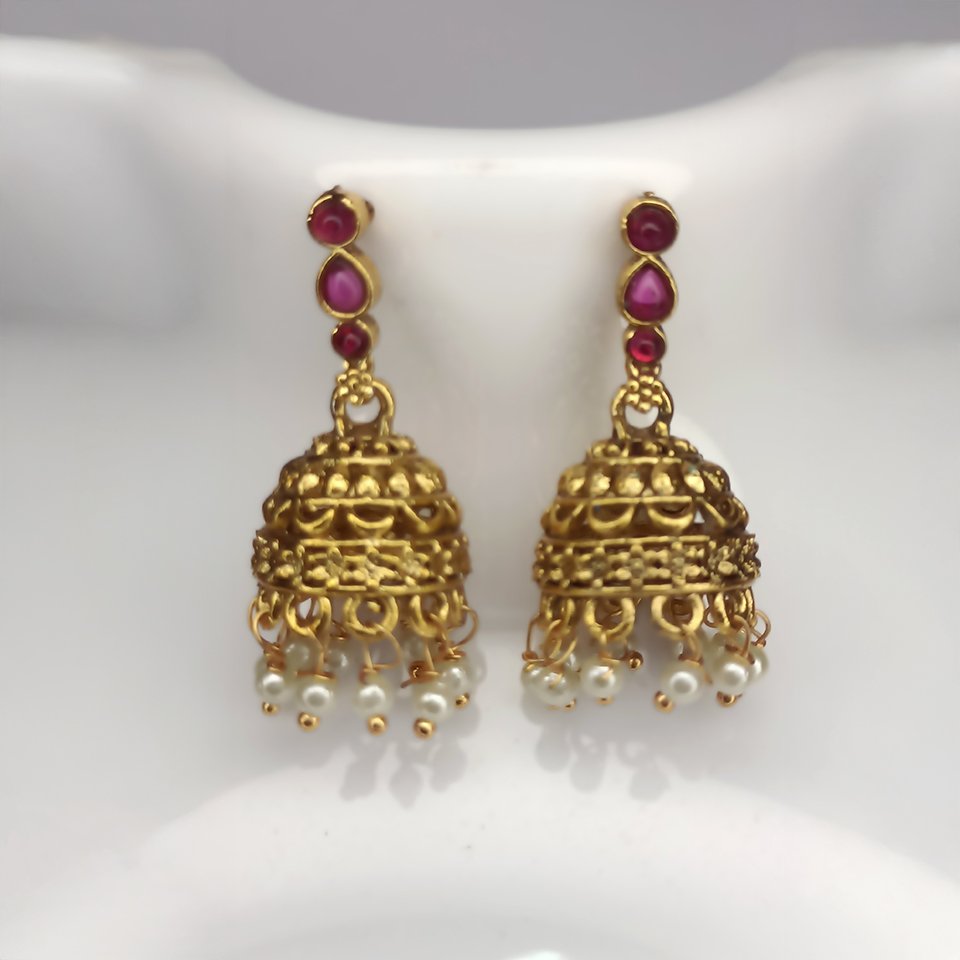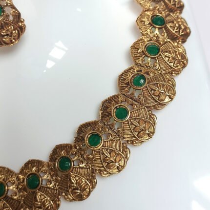 The set is paired with stunning jumka earrings, embellished with matching ruby stones and finished with delicate white pearl hangings that add movement and sophistication. The antique gold polish enhances the richness of the design, making it perfect for weddings, cultural celebrations, festivals, and special occasions.