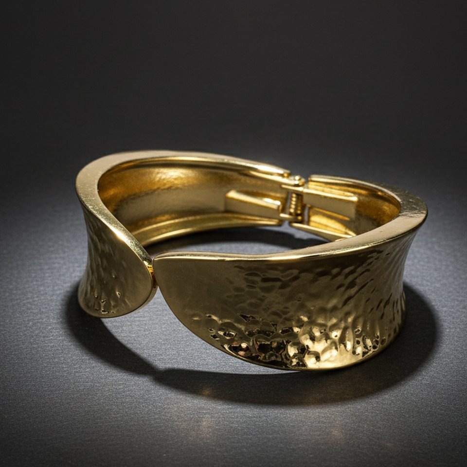 A sculptural gold-tone bangle with a soft wave silhouette and hammered texture, crafted from durable stainless steel for a refined, artisanal-luxury look.