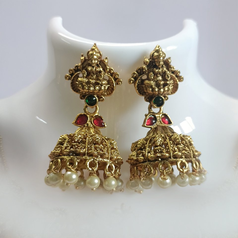 The Bhavya Lakshmi Temple Necklace is a grand, antique gold–plated masterpiece featuring intricate Lakshmi motifs, kemp stones, and delicate bead droplets. Paired with matching jhumkas, this set adds a rich, traditional charm to any festive or bridal look.