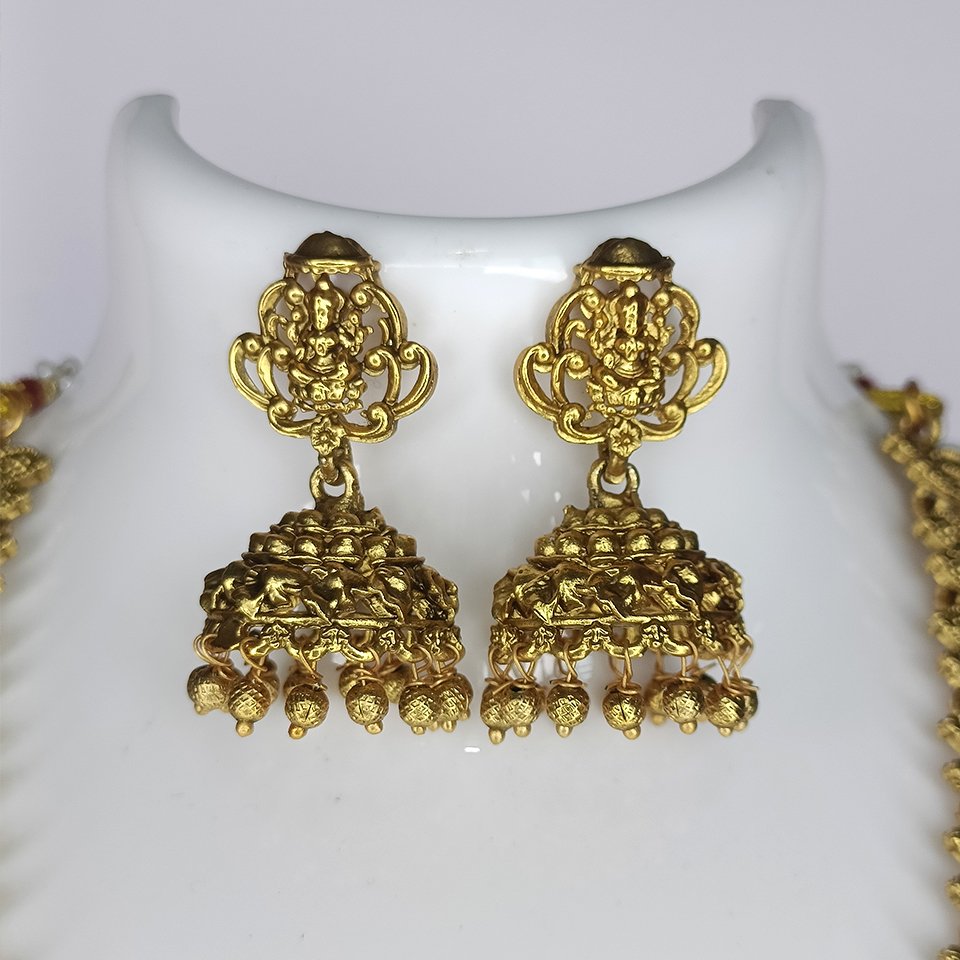 Complemented with matching temple jhumkas, this necklace set elevates any traditional attire, making it an ideal choice for weddings, classical events, festive occasions, and bridal trousseaus. A stunning expression of tradition and craftsmanship.