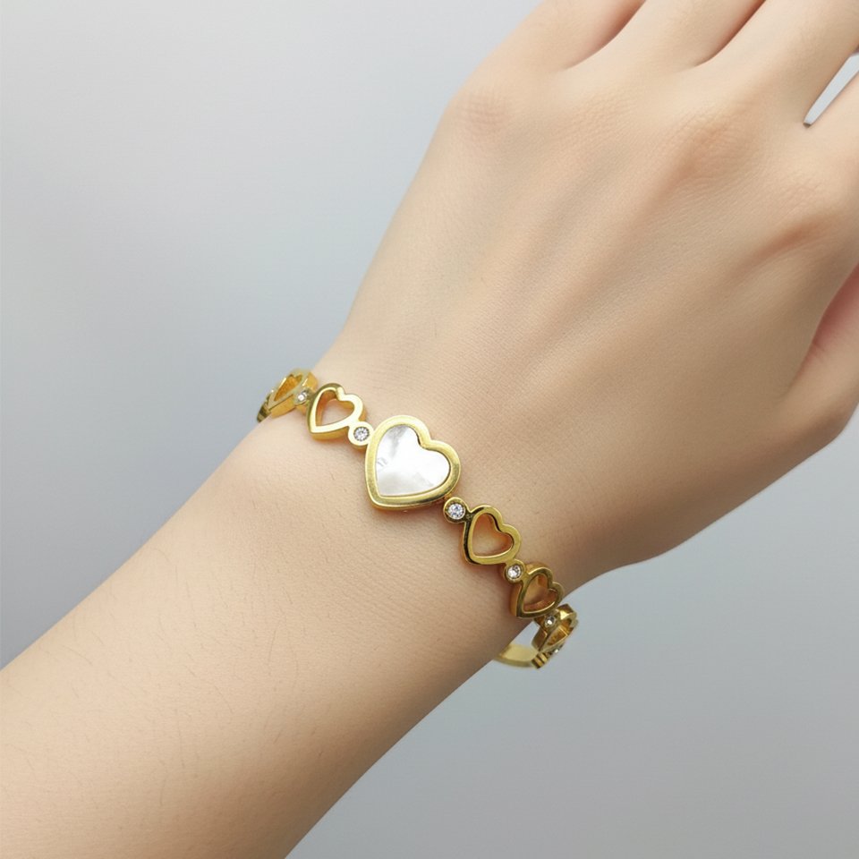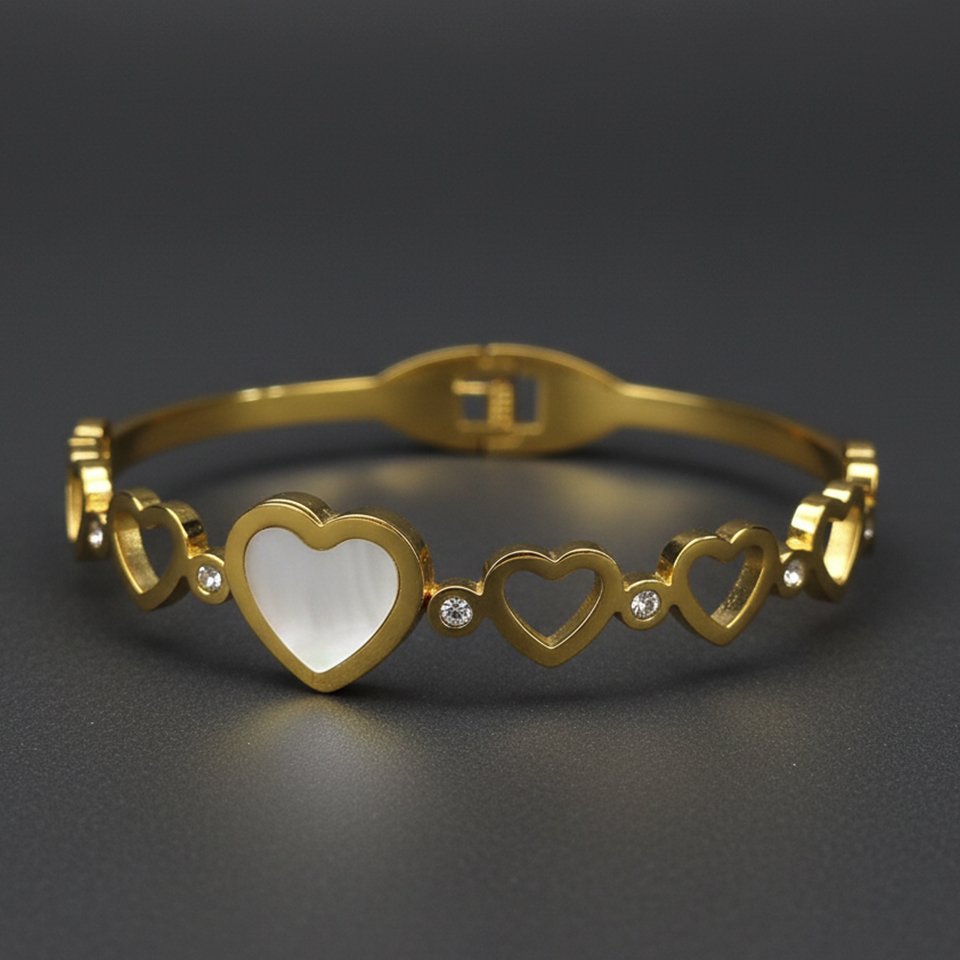 The Golden Hearts Bangle blends timeless charm with modern durability. Made from high-quality stainless steel, it features a radiant gold-tone finish and a series of beautifully crafted heart shapes—each one symbolizing love, connection, and a little bit of sparkle.