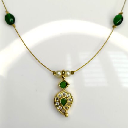 The clean lines and rich green hue create a striking contrast against the warm gold finish, making it perfect for both everyday elegance and festive occasions. Whether styled with ethnic wear or contemporary ensembles, the Jade Aura Necklace adds a subtle yet captivating glow.