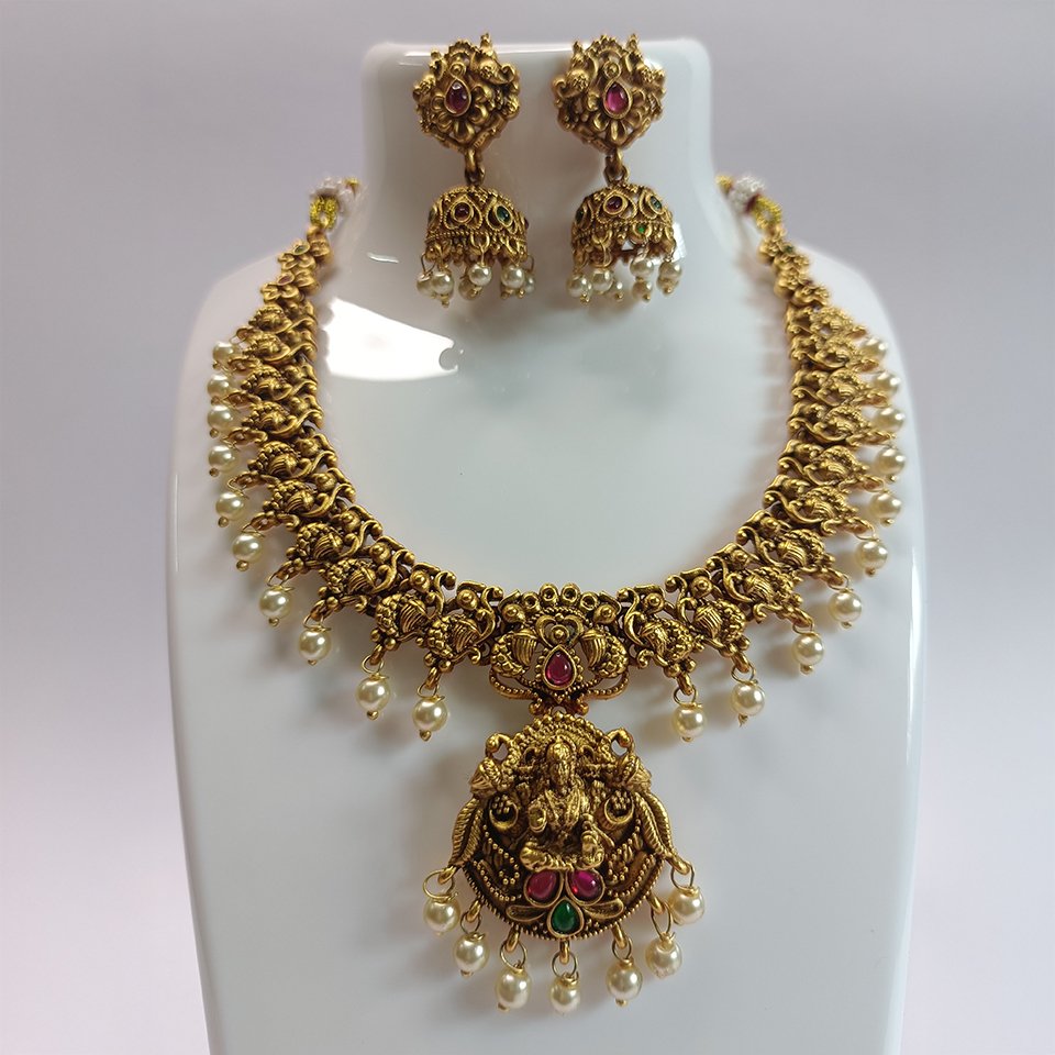 Designed with antique gold plating, the necklace is adorned with delicate motifs, shimmering stones, and classic pearl droplets that enhance its royal charm. The matching jhumkas complete the ensemble, making it a perfect choice for weddings, festivals, and grand celebrations.