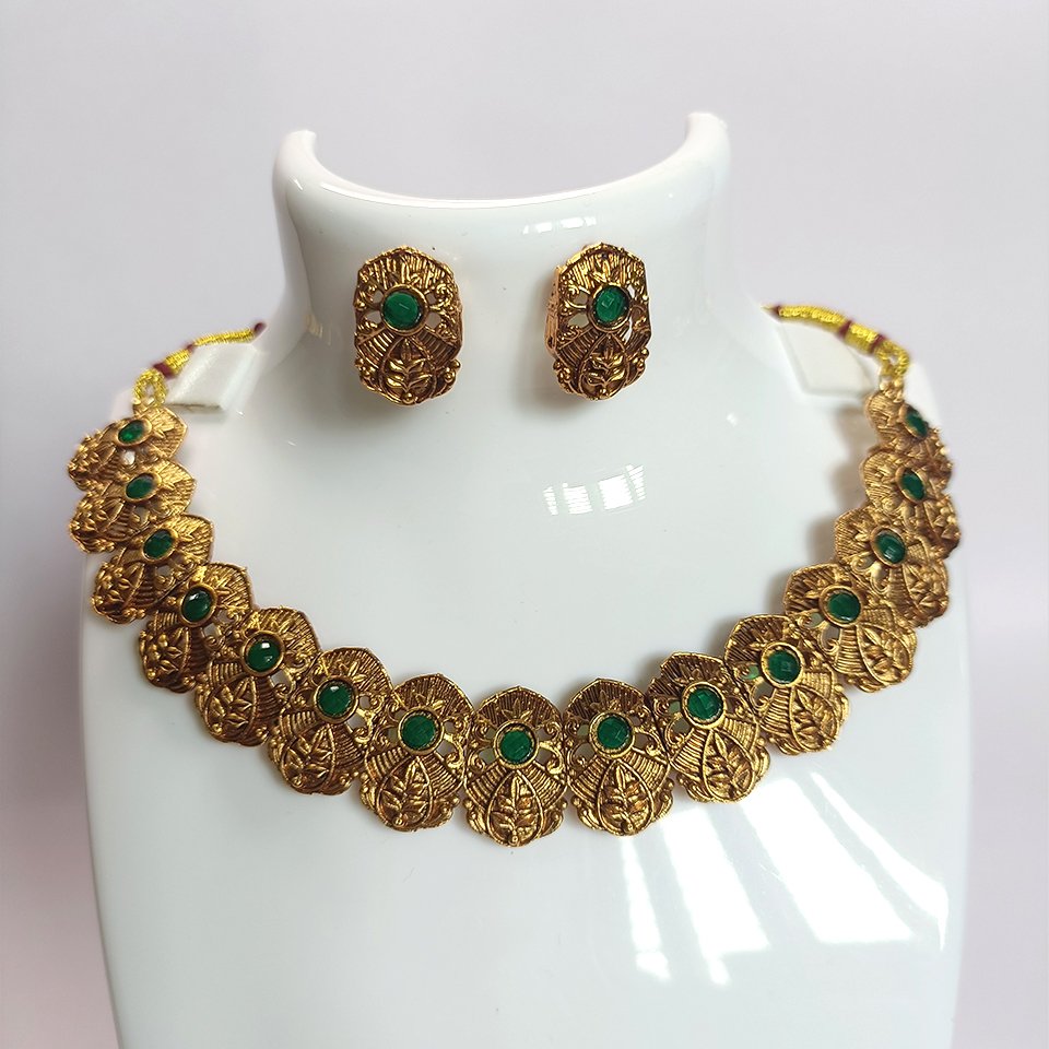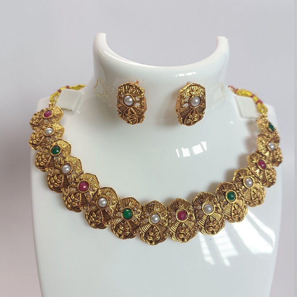 The Pearl Blossom Necklace features an intricately handcrafted antique-finish design adorned with elegant carved motifs and vibrant stone highlights. Paired with matching ear studs, this timeless jewellery set adds a regal charm to any festive or traditional outfit. Available in 3 beautiful colours – Multicolour, Red, and Green.