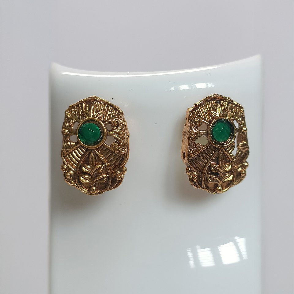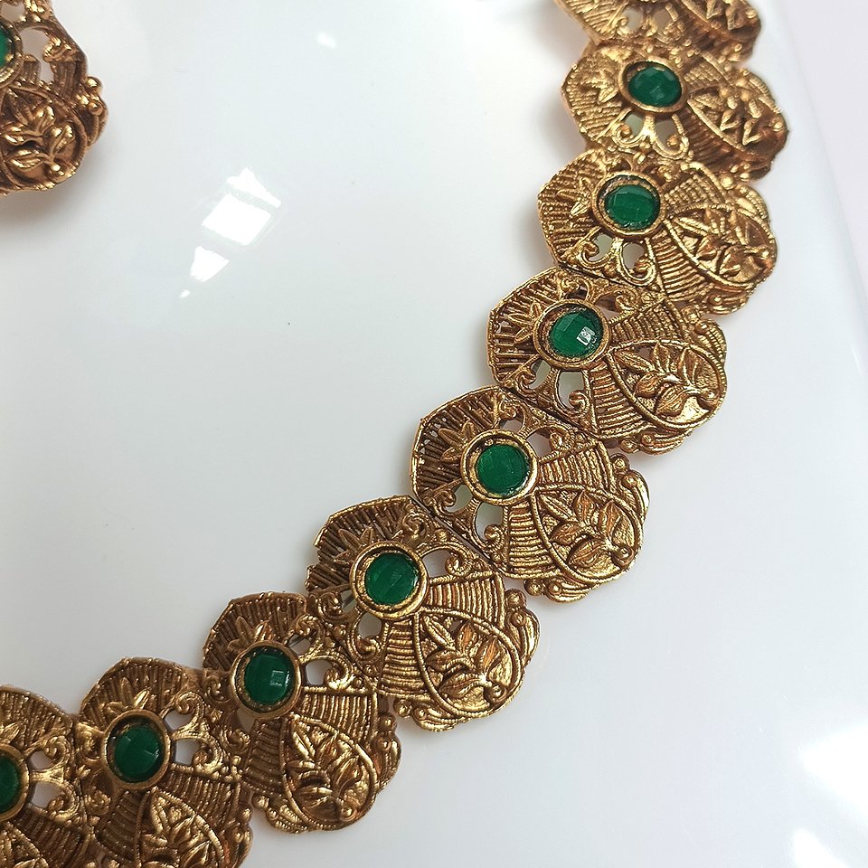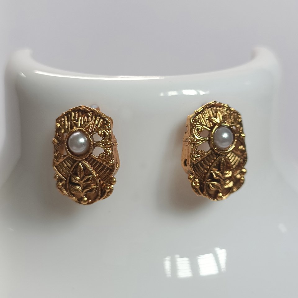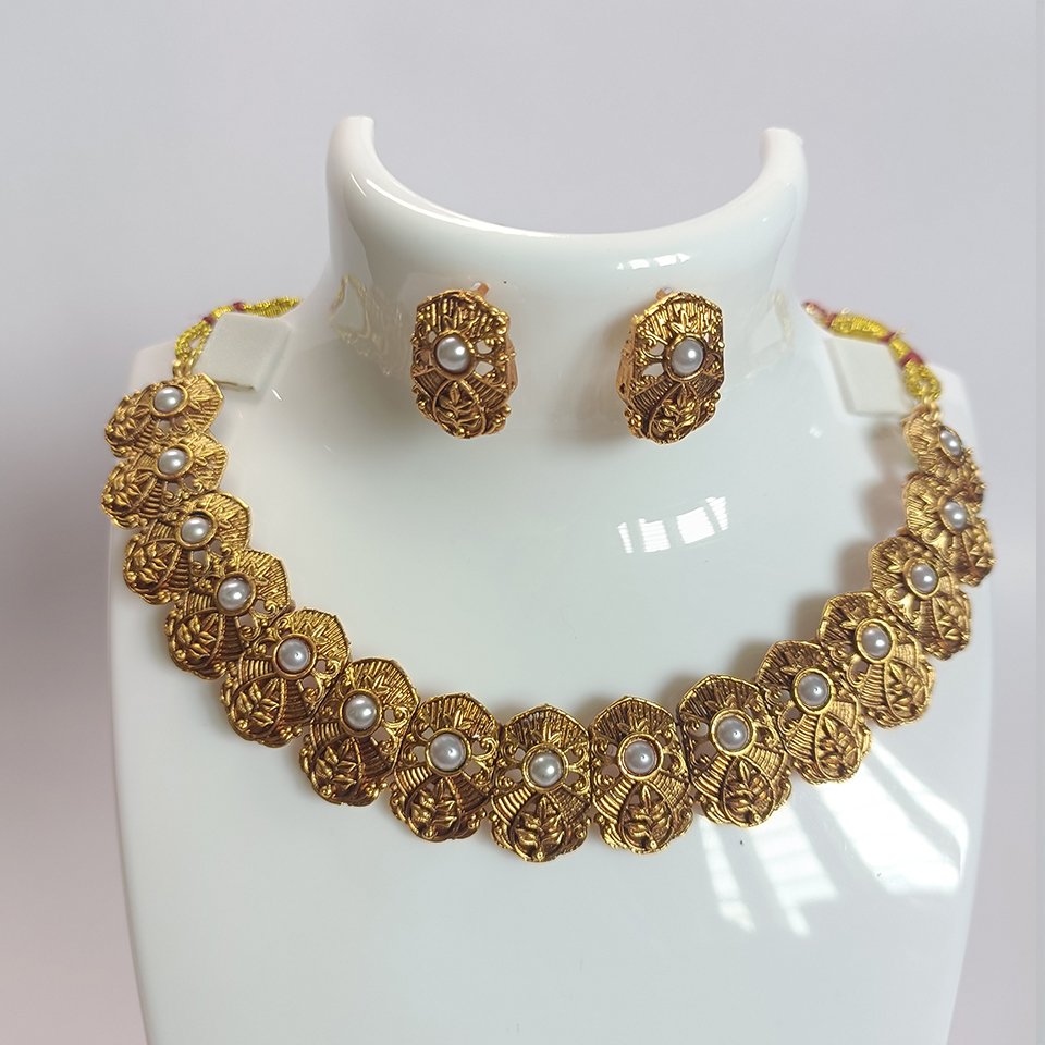 This set includes matching ear studs designed to complement the necklace perfectly, featuring the same antique texture and pearl embellishments. The necklace sits gracefully on the neckline and pairs effortlessly with silk sarees, ethnic wear, or festive ensembles, making it ideal for weddings, celebrations, and special occasions.