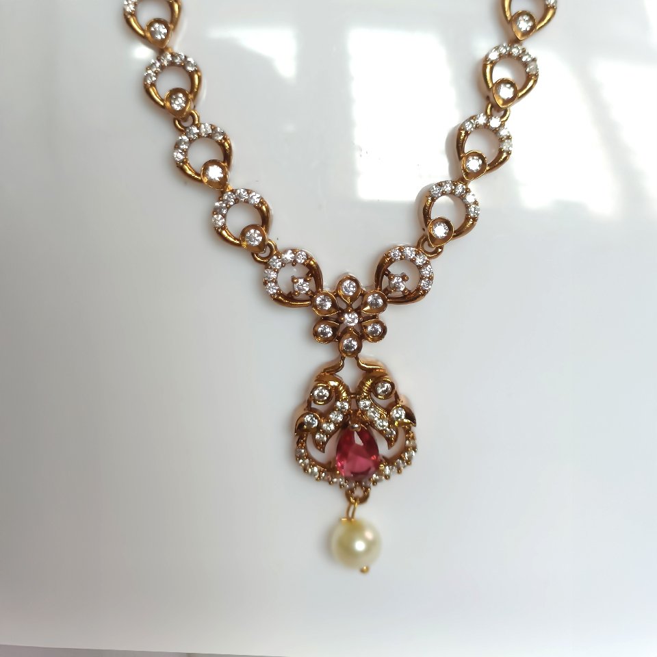 A delicate and elegant necklace featuring sparkling AD stones, a radiant ruby centerpiece, and a graceful pearl drop. The perfect blend of simplicity and charm for festive and everyday ethnic looks.