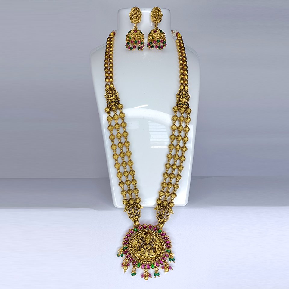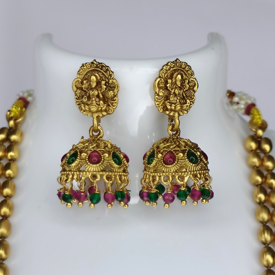 The set includes elaborately hand-crafted jhumkas with complementing Lakshmi motifs and pearl drop detailing, completing the traditional aesthetic.