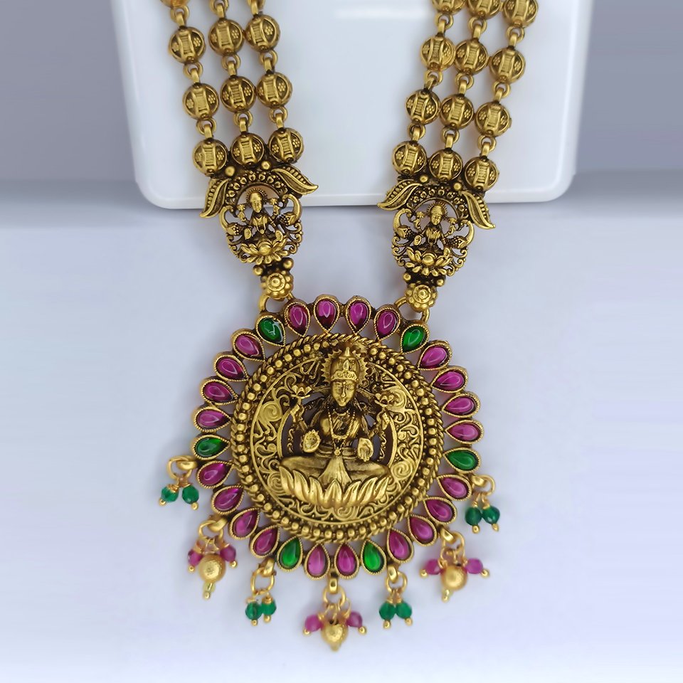 The Rajamudra Lakshmi Haram is an exquisite temple jewellery masterpiece crafted to reflect timeless South Indian heritage. This long haram features intricately carved antique gold-tone motifs arranged in a continuous pattern, symbolising prosperity and divinity. At the heart of the design lies a majestic Goddess Lakshmi pendant, meticulously detailed with traditional craftsmanship that highlights her seated form, radiating grace and abundance.